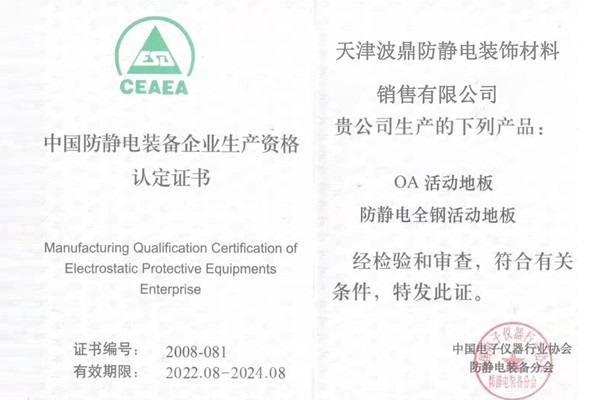 中國防靜電裝備企業(yè)生產資格認定證書